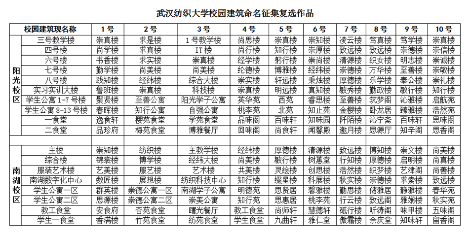 弦歌不辍,风雨历练,纺大甲子,薪火相传。今年10月18日,纺大将迎来办学60周年庆典。为进一步加强校园文化建设,学校开展了校园建筑命名征集,近一个半月的征集活动得到校友和师生的广泛参与,其间共征集作品近80件。在此,对参与本次征集活动的朋友表示诚挚的感谢!