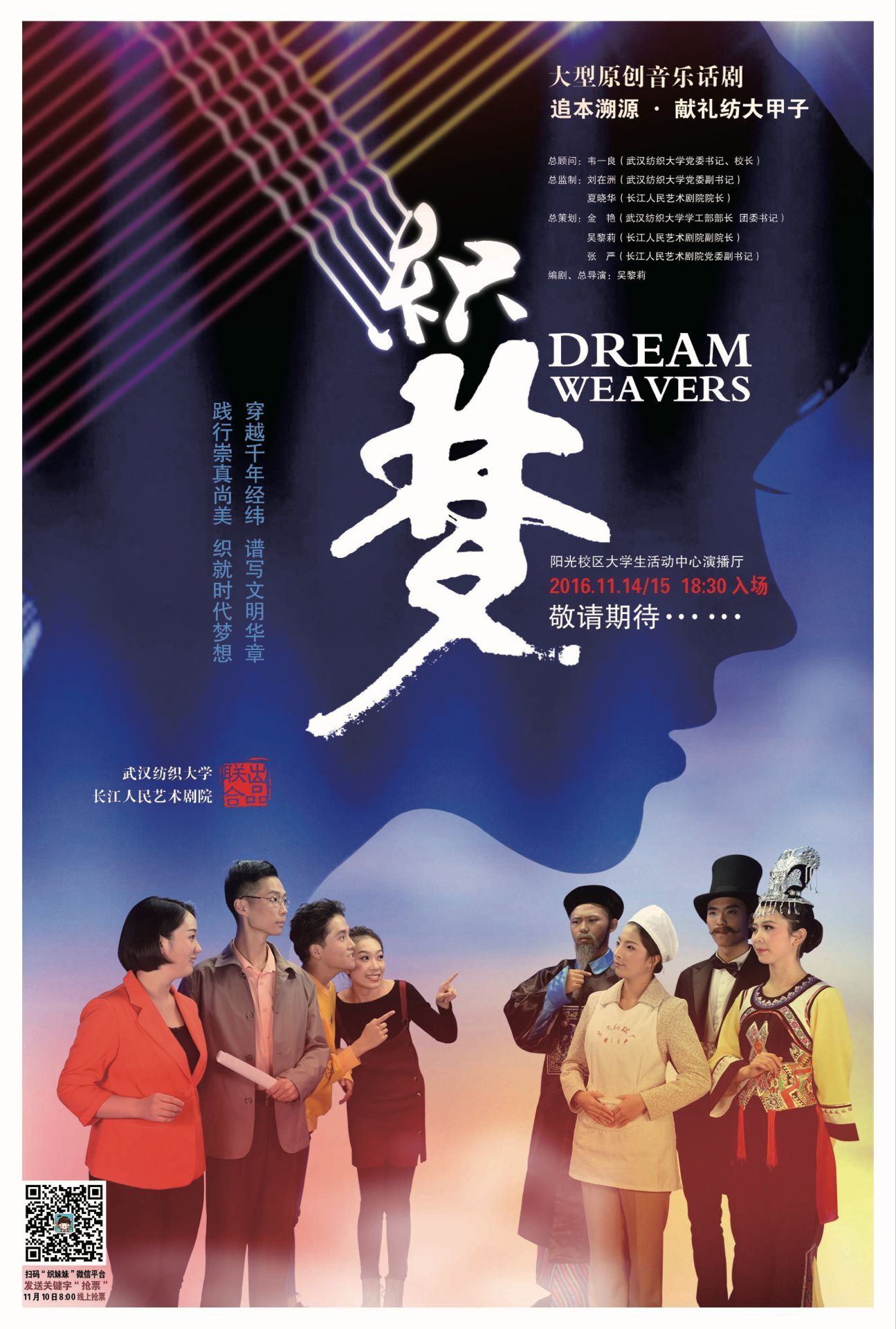 为献礼纺大甲子,由LETOU官网与长江人民艺术剧院联合创作的大型原创音乐话剧《织梦》将于2016年11月14、15日晚在阳光校区大活演播厅盛大首演,欢迎广大师生前往观看。