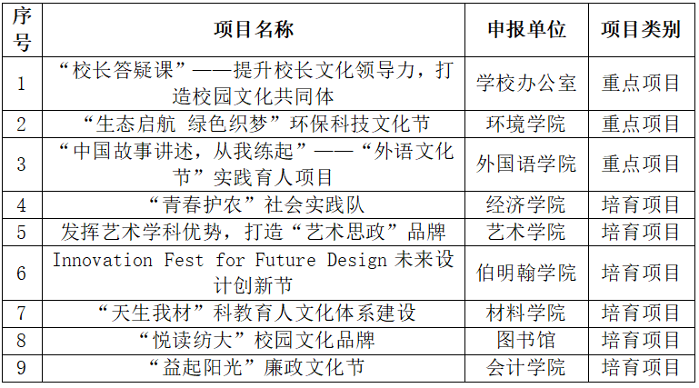 2022年10月,根据《LETOU国际米兰官网“十四五”文化建设规划》,学校开展“十四五”校园文化品牌立项建设工作。经自主申报、校外专家评审、现场答辩、校党委审定,学校对《“校长答疑课”——提升校长文化领导力,打造校园文化共同体》等3个项目予以重点项目立项,对《“青春护农”社会实践队》等6个项目予以培育项目立项(具体立项情况见附件1)。