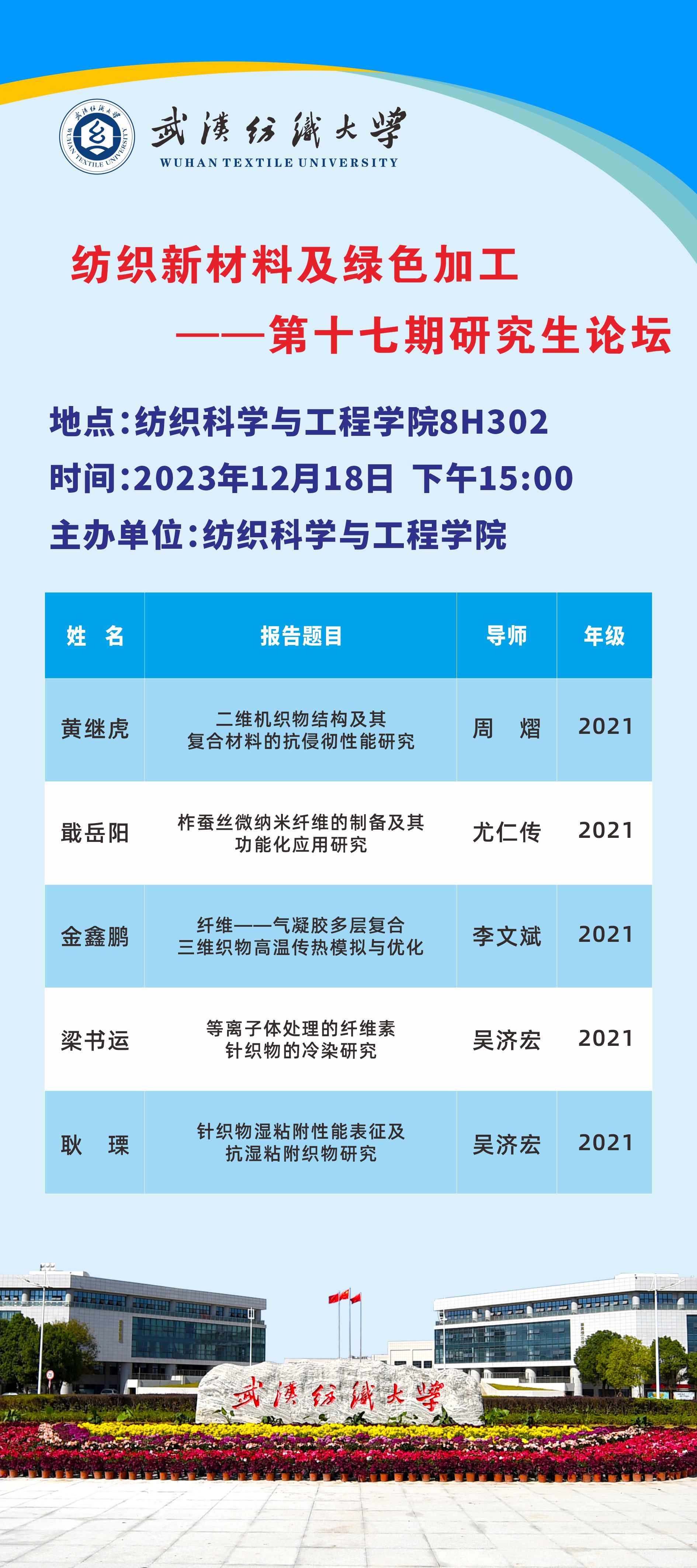 学术预告:第493期研究生学术论坛暨纺织科学与工程学院2023年第12期研究生学术论坛