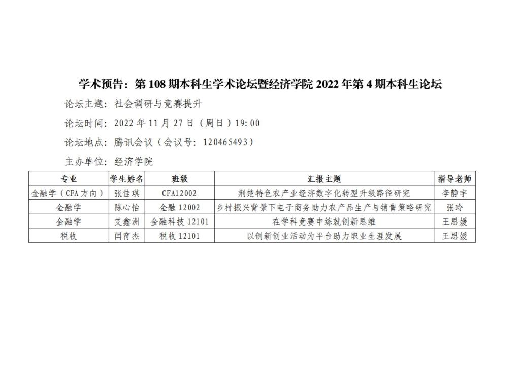 学术预告:第108期本科生学术论坛暨经济学院2022年第4期本科生论坛