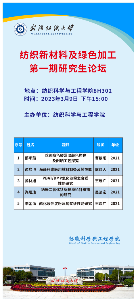 学术预告:第205期研究生学术论坛暨纺织科学与工程学院2023年第1期研究生学术论坛