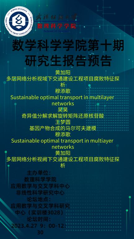 学术预告:第304期研究生学术论坛暨数理科学学院2023年第10期研究生学术论坛