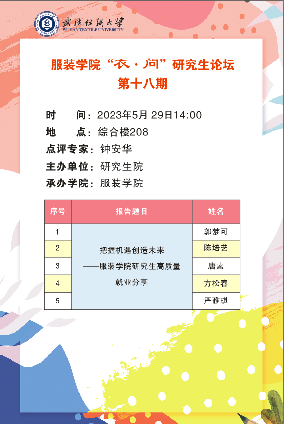 学术预告:第307期研究生学术论坛暨服装学院2023年第5期研究生学术论坛