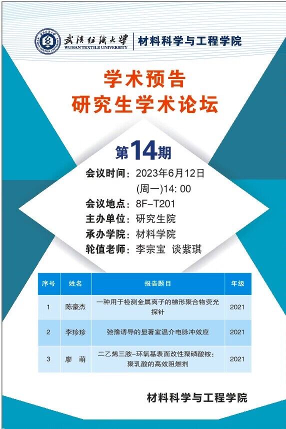 学术预告:第314期研究生学术论坛暨材料科学与工程学院2023年第14期研究生学术论坛