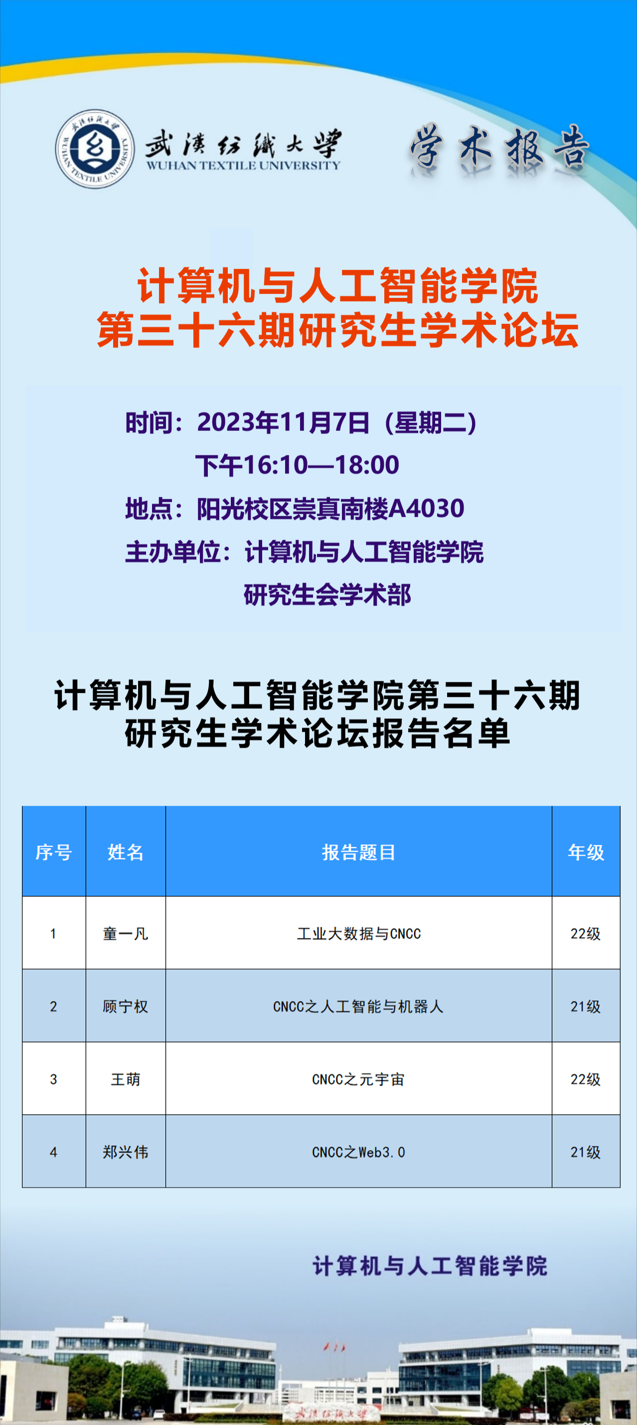 学术预告:第397期研究生学术论坛暨计算机与人工智能学院2023年第12期研究生学术论坛