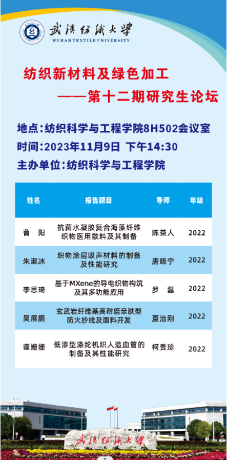 学术预告:第400期研究生学术论坛暨纺织科学与工程学院2023年第4期研究生学术论坛